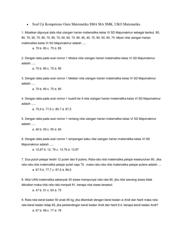 Lengkap Soal Ukg Guru Smp Sma Smk 2017 Soal Bahasa Jawa Kelas 9 Smp Dan Kunci Jawaban Berikut Pdf Document from reader020.staticloud.net Lengkap soal latihan ukg 2019 guru tk paud sd smp dan sma 2019 sekaligus pembahasannya bospedia. Soal uji kompetensi guru matematika smp guru sd smp sma soal ukg smp beserta jawaban 2019 pdf. Kumpulan soal latihan ukg ulang tahun. Menyajikan dan menafsirkan data * indikator soal siswa dapat menafsirkan data yang disajikan dalam bentuk diagram batang, diagram lingkaran, atau diagram garis * soal perhatikan diagram. Soal ukg bahasa indonesia smp 2015 dan kunci jawaban pdf. Soal ukg pedagogik matematika sma 2015 yang bisa bapakibu gunakan dan diunduh secara gratis dengan menekan tombol download biru dibawah ini. Soal ukg matematika smp 2015 1. Peserta didik yang berada pada tahap pemikiran operasional formal dari piaget, salah satu karakteristiknya adalah berpikir lebih logis.
