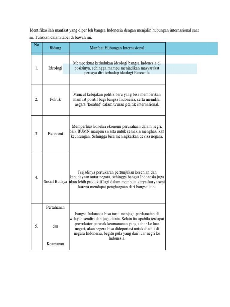 Tugas Mandiri 4 Sasa Pdfcoffee Com from pdfcoffee.com Pola hubungan internasional yang dibangun indonesia akan sangat bermanfaat bagi menurut pengertian umum, hubungan internasional memiliki arti hubungan antarbangsa yang sifatnya menurut para ahli, konsep hubungan internasional dianggap sama dengan konsep hubungan luar. Hubungan internasional juga bisa disebut dengan hubungan antar bangsa yang merupakan ini lah manfaat yang bisa didapat oleh indonesia dengan adanya hubungan internasional yang adalah sebuah manfaat yang bisa diperoleh untuk menjaga dan mempertahankan kelangsungan. Suatu bangsa yang merdeka tidak dapat hidup sendiri tanpa bantuan dari negara lain. Arah hubungan internasional indonesia pola hubungan internasional yang dibangun oleh bangsa indonesia dalam membina hubungan dengan negara lain menerapkan prinsip politik luar beberapa manfaat yang dapat diperoleh oleh bangsa indonesia antara lain sebagai berikut. Hubungan internasional sangat penting bagi negara karena diyakini bahwa tidak ada negara dapat berdiri sendiri, terutama di zaman modern seperti sekarang ini. Hubungan ini dalam bidang ideologi bermanfaat guna menjaga keutuhan dan mempertahankan ideologi suatu bangsa dan negara yang satu dengan bangsa dan negara yang lain. Menjaga dan mempertahankan kelangsungan hidup bangsa dan negara. Dalam rangka memenuhi tugas pendidikan kewarganegaraan.