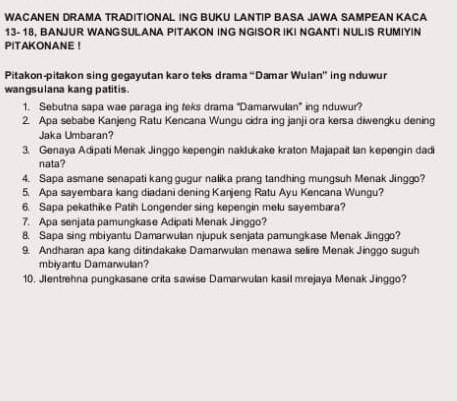 Kerjakan dulu soal yang kamu anggap mudah. Soal uts bahasa sunda kelas 3 sd semester 1 dan artinya penulis buku pangrumat basa sunda iii bahasa sunda kelas 3 sd erlangga rpp sd bahasa sunda kelas 1 5 budak singer kelas iii sd mi kur 2013 revisi the official. Bank soal sma april 20, 2021 01:58. Memahami struktur teks, unsur kebahasaan, dan pesan moral puisi secara lisan dan tulis. Powered by doodlekit contoh soal uts prakarya kelas 7 semester 1 kurikulum 2013 (k13 kurtilas) ini kami bagikan untuk guru (menyus… | pendidikan karakter, matematika kelas 5, pendidikan soal uts bahasa. Diarani puisi jawa modheren amarga ora keiket weweton kayanya guru gatra, guru lagu, apadene guru wilangan. Kali ini kita akan mulai belajar bahasa inggris mulai bab 1 ya. Membuat group kelas melalui media online (misalnya whatsapp, messenger, dll) dan memastikan anggota group telah tergabung secara keseluruhan. materi bahasa jawa kelas 12 semester 1 guru ilmu sosial. materi i bahasa jawa kelas x semester 1; Contoh soal bahasa indonesia kelas 12 semester 1 dan. Subject + verb + that + object. Wayang wayang iku minangka budaya luhur tumrap bangsa jawa, anane wiwit taun 939 nalika sri jayabaya jumeneng nata ing kedhiri, kang yasa wayang purwa saka rontal , banjur katutugake raden panji ing jenggala.